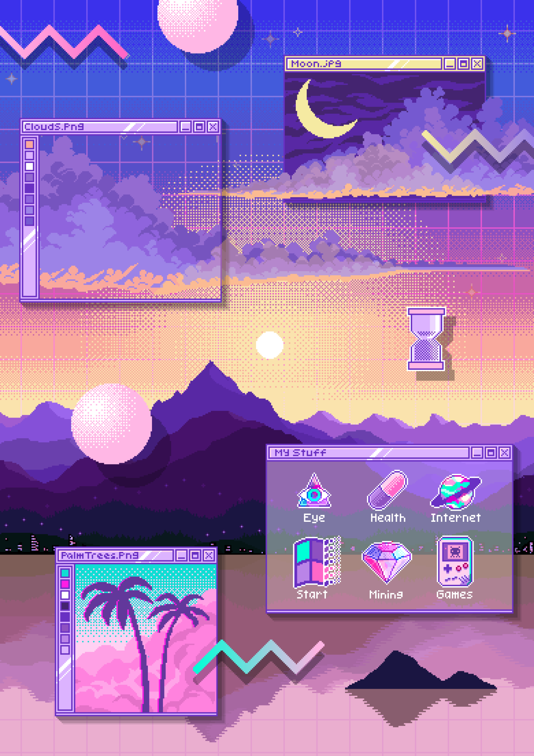 This A4 art print showcases vibrant retrowave pixel art of a mountain and sunset setting inspired by the nostalgic Windows 95 interface, featuring neon colours, geometric shapes, and a stylised windows and icons.